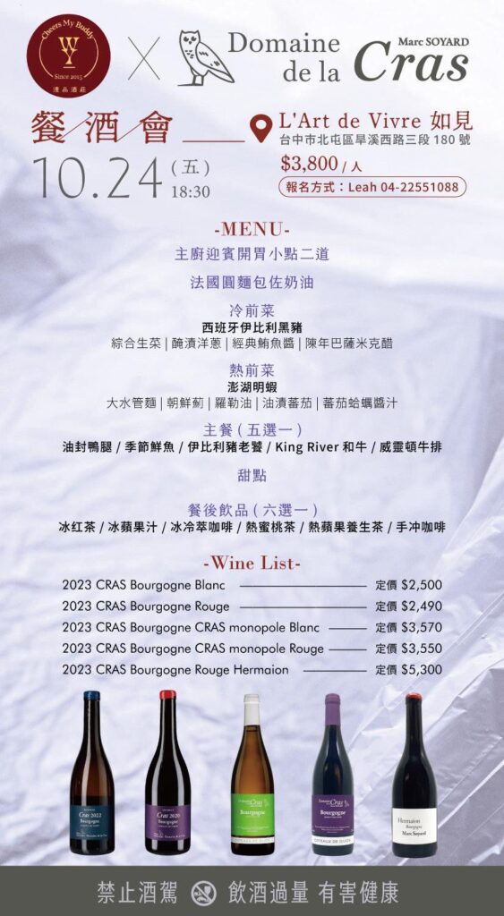秋季限定|法式餐酒晚宴 發佈日期: 30 10 月, 2025 作者: admin 10/24我們想和你一起喝「不一樣的勃根地」— 全法酒評都驚嘆的 Domaine de la Cras— 全新年份紅白一次品嚐,一定是今年秋天最美的一夜秋季限定|法式餐酒晚宴費用:$3800/人時間:2025/10/24(五) 18:30餐廳:L’Art de Vivre 如見地址:台中市北屯區旱溪西路三段180號https://maps.app.goo.gl/wSLMBBjN6bRp6VHD8?g_st=ipc未成年請勿報名未成年請勿飲酒酒後不開車,開車找代駕